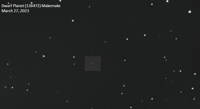 Dwarf planet (136472) Makemake on the night of March 27, 2023, as it moves slowly across a small patch of sky in the constellation Coma Berenices. The area inside the highlighted box was enhanced to make the faint Makemake appear brighter. This animation shows 2.75 hours of movement. Field of view 29 x 16 arcminutes. North is up. East is left. For a full-size image, click here. [1]