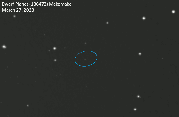 I made two attempts to catch dwarf planet (136472) Makemake in March. The first, in early March, was not so good, mostly the result of operator error and high thin clouds rolling across the field of view during the imaging run. During early spring here in central Oklahoma a night without clouds, high wind, and Moon is hard to come by so I wasn’t able to try again until March 27th with just two out of the three (no wind or clouds). I got better results this time out. The animations below capture just under three hours of Makemake’s movement. Image details are in the endnotes.
